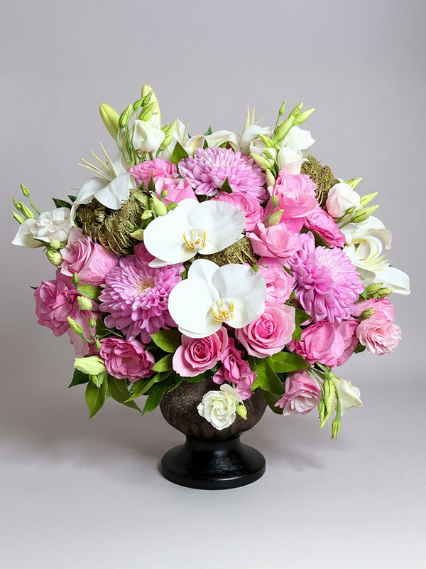 seramik vazo içerisinde pembe anastasia çiçekleri, pembe gülleri pembe lisyantus çiçeği ve beyaz lilyum çiçekleri, beyaz orkide çiçeği ve diğer yeşillikler ile hazırlanır. Canlı çiçekler mevsimsel olarak farklılık gösterebilir tasarım bütünlüğü bozulmadan hazırlanır aynı gün adrese teslim edilir.