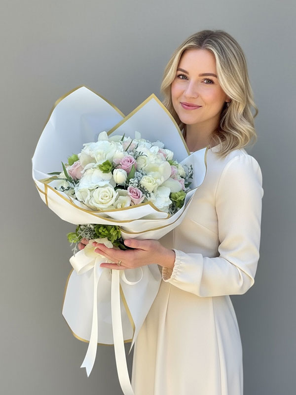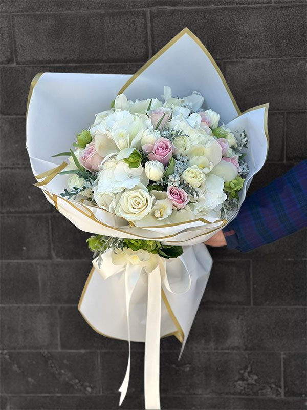 Beyaz Ortanca çiçekleri, Beyaz güller, pembe güller, beyaz lale, spidyum orkide vb mevsimin en taze fresh çiçekleri ile hazırlanır. Canlı çiçekler mevsimsel olarak farklılık gösterebilir tasarım bütünlüğü bozulmadan hazırlanır.