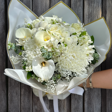 Tamamı canlı çiçeklerden oluşur mevsimin en taze çiçekleri ile tasarlanır. İçerisinde Beyaz Anastasia çiçekleri gala çiçeği beyaz top biçme çiçekler beyaz güller ve diğer biçme çiçekler ile hazırlanır. Canlı çiçekler mevsimsel olarak farklılık gösterebilir tasarım bütünlüğü bozulmadan oluşur aynı gün içerisinde adrese teslim edilir.