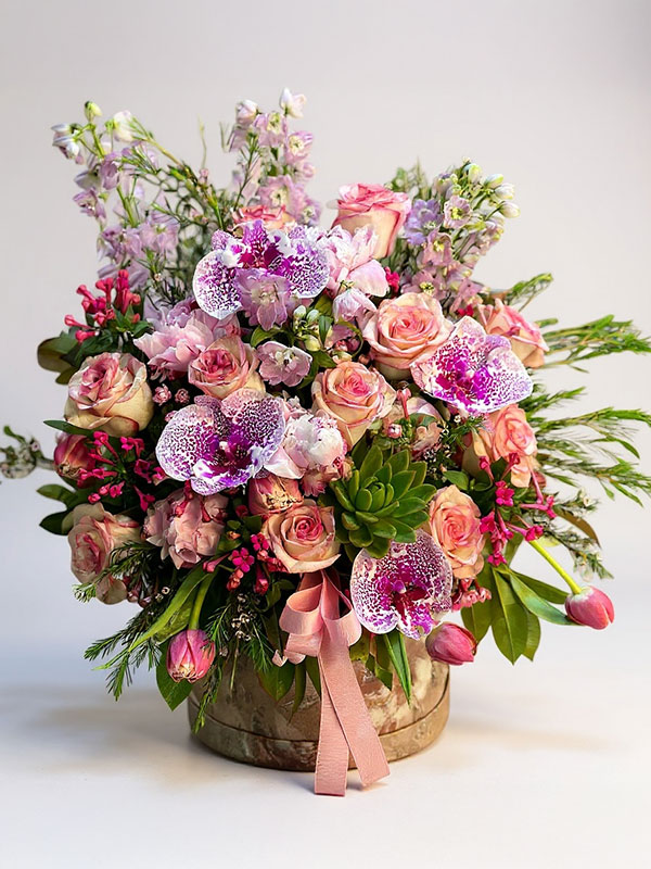 pembe güller, pembe lale , pembe şakayık çiçeği , pembe Delphinium ( delfinyum) çiçekleri kaktüs çiçeği ve diğer biçme çiçekler ile hazırlanır. Canlı çiçekler mevsimsel olarak farklılık gösterebilir tasarım büünlüğü bozulmadan hazırlanır aynı gün içerisinde adrese teslim edilir.