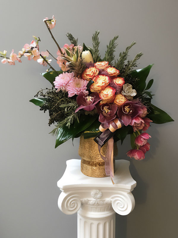 Seramik vazo içerisinde muhteşem güller, pembe anastasia çiçekleri, bahar dalları, pembe laleler spidyum orkide ve diğer çiçeklerden oluşur. canlı çiçekler mevsimsel olarak farklılık gösterebilir tasarım bütünlüğü bozulmadan hazırlanır.